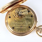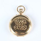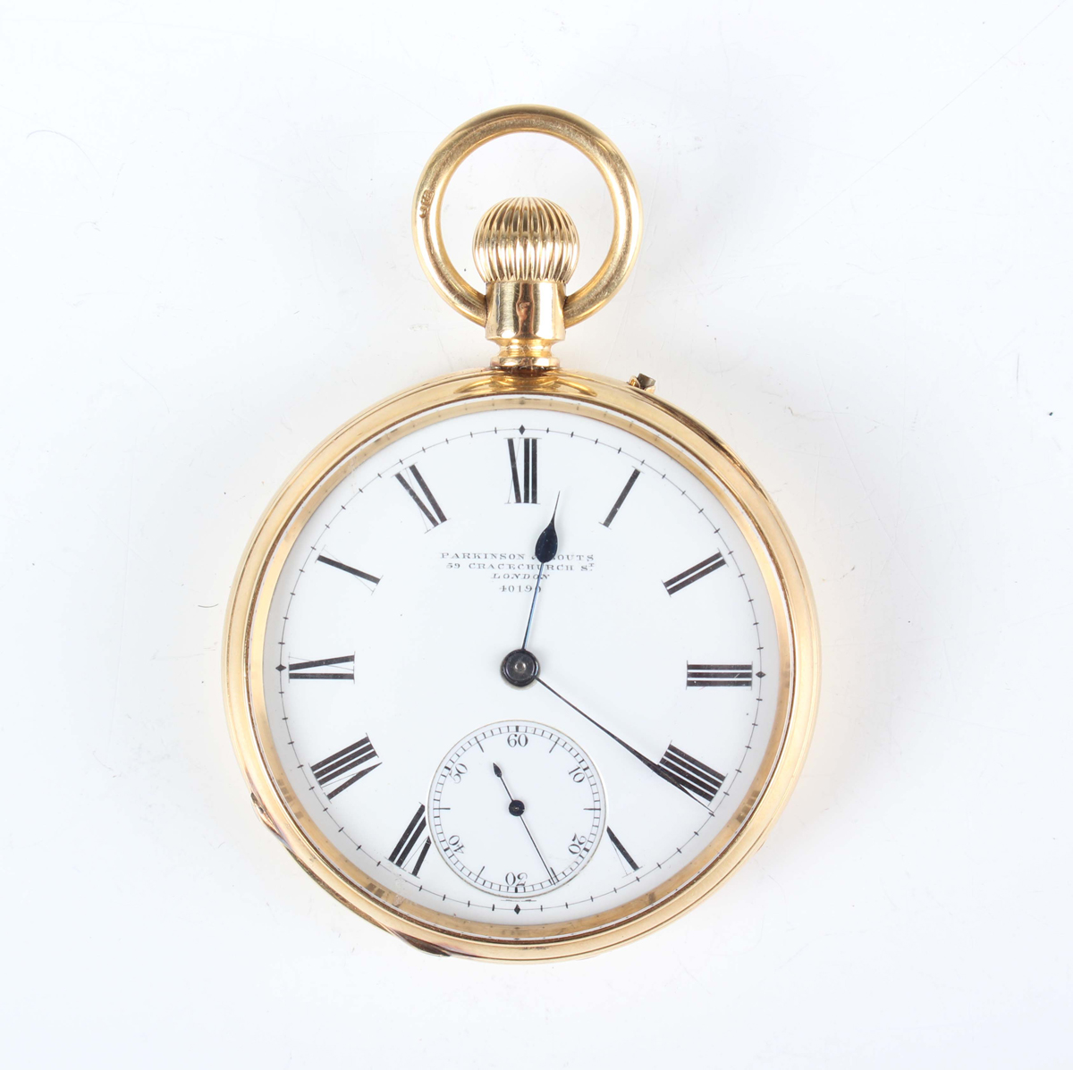 An 18ct gold cased keyless wind open-faced gentleman's pocket watch with jewelled three-quarter plate movement, the backplate detailed 'Parkinson & Bouts 59, Gracechurch St London No. 40190, Chronometer Makers to the Royal Navy', the similarly signed white enamelled dial with black Roman hour numerals and subsidiary seconds, with gold inner case, the case back monogram engraved, London 1876, total weight 124g, case diameter 5.2cm.