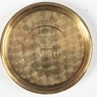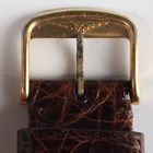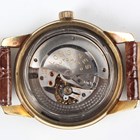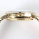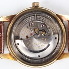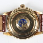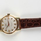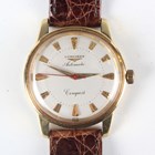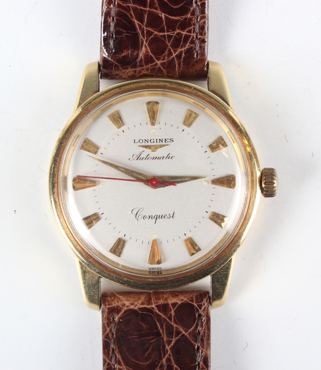 A Longines Conquest Automatic 18K gold circular cased gentleman's wristwatch, circa 1955, the signed and jewelled 19 AS caliber movement numbered '9698848', the signed silvered dial with gilt hour markers and red centre seconds hand, the signed case back interior detailed '18K 0,750', the case back with enamelled logo, case diameter 3.4cm, on a brown leather strap.
