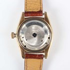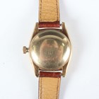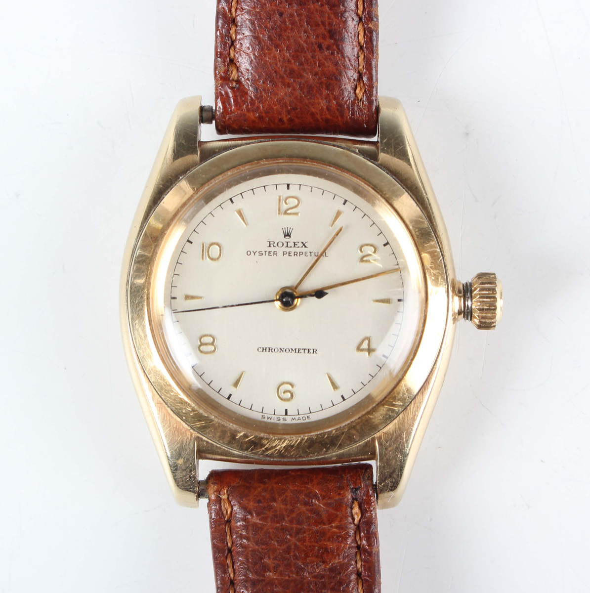 A Rolex Oyster Perpetual Chromometer 14K gold bubble back cased gentleman's wristwatch, Ref. 3131, circa 1947, the signed and jewelled automatic movement numbered 'N 41381', the signed silvered dial with gilt Arabic numeral and arrowhead hour markers and centre seconds, the signed case back interior detailed '14K 0.585' and numbered '3131', the tonneau shaped case numbered between the lugs '550422', the winder detailed 'Oyster Patent', case width 3.2cm, on a brown leather strap.