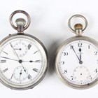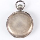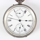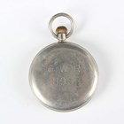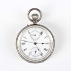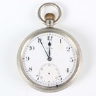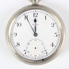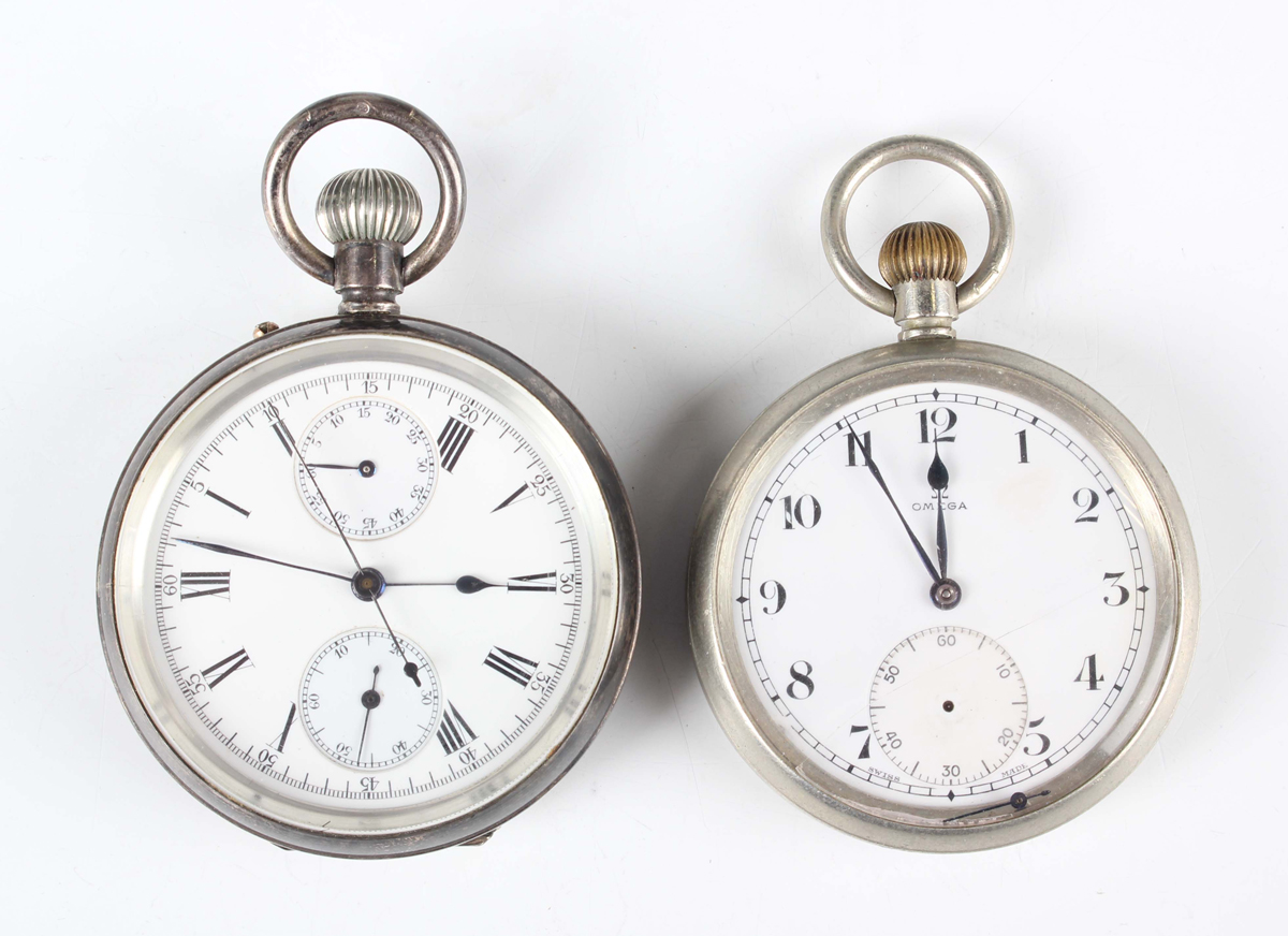 An Omega G.W.R. (Great Western Railway) nickel cased keyless wind open-faced gentleman's pocket watch, circa 1939, the signed and jewelled movement numbered '9225268', with dust cover, the signed white enamelled dial with black Arabic hour numerals and subsidiary seconds, the case back detailed 'G.W.R. 01985', case diameter 5cm (glass cracked), together with a silver cased keyless wind open-faced gentleman's chronograph pocket watch with B & Co jewelled movement, the white enamelled dial with two subsidiary dials, import mark Edinburgh 1929, case diameter 5.2cm.