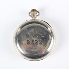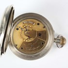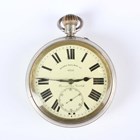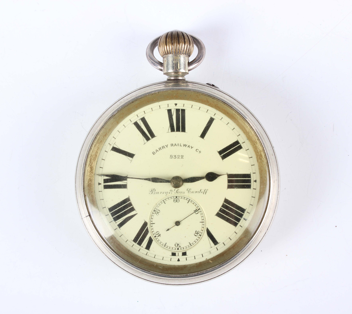 A G.W.R. (Great Western Railway) nickel cased keyless wind open-faced gentleman's pocket watch, the gilt movement detailed 'Rotherhams London 175897', the white enamelled dial with black Roman hour numerals and subsidiary seconds and detailed 'Barry Railway Co 9322' above 'Barry & Sons Cardiff', the case back detailed 'G.W.R. 9322', case diameter 5.7cm.