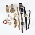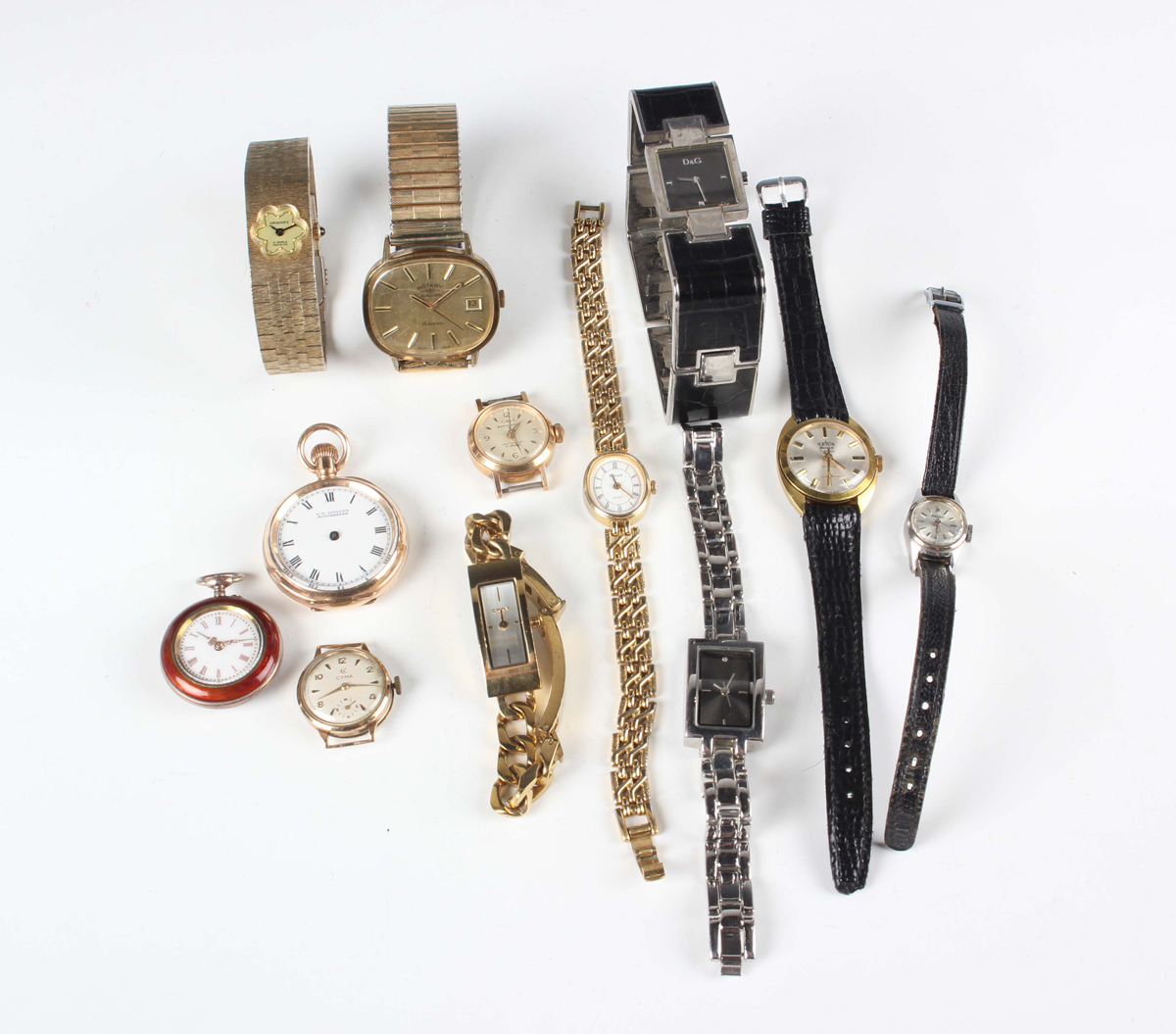 A Cyma 9ct gold circular cased lady’s wristwatch, London 1958, case diameter 2.1cm, a red and gilt enamelled silver cased keyless wind lady’s open-faced fob watch, case diameter 2.8cm, a gilt metal cased keyless wind open-faced lady’s fob watch, a Rotary Automatic gilt metal and steel backed gentleman’s wristwatch, fitted with an expanding bracelet, and eight various ladies' wristwatches.