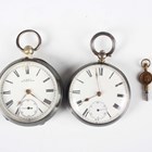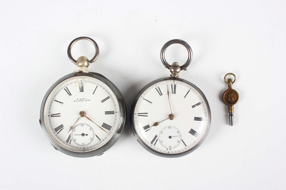 A silver cased keywind open-faced gentleman’s pocket watch, the gilt fusee movement with lever escapement, detailed to the backplate ‘Jas Northwood, Newport No12848’, with dust cover, London 1869, case diameter 5cm, with a key, together with a silver cased keywind open-faced gentleman’s pocket watch, the back plate detailed ‘Am Watch Co, Waltham, Mass 7947683’, Birmingham 1897, case diameter 5.2cm.