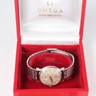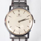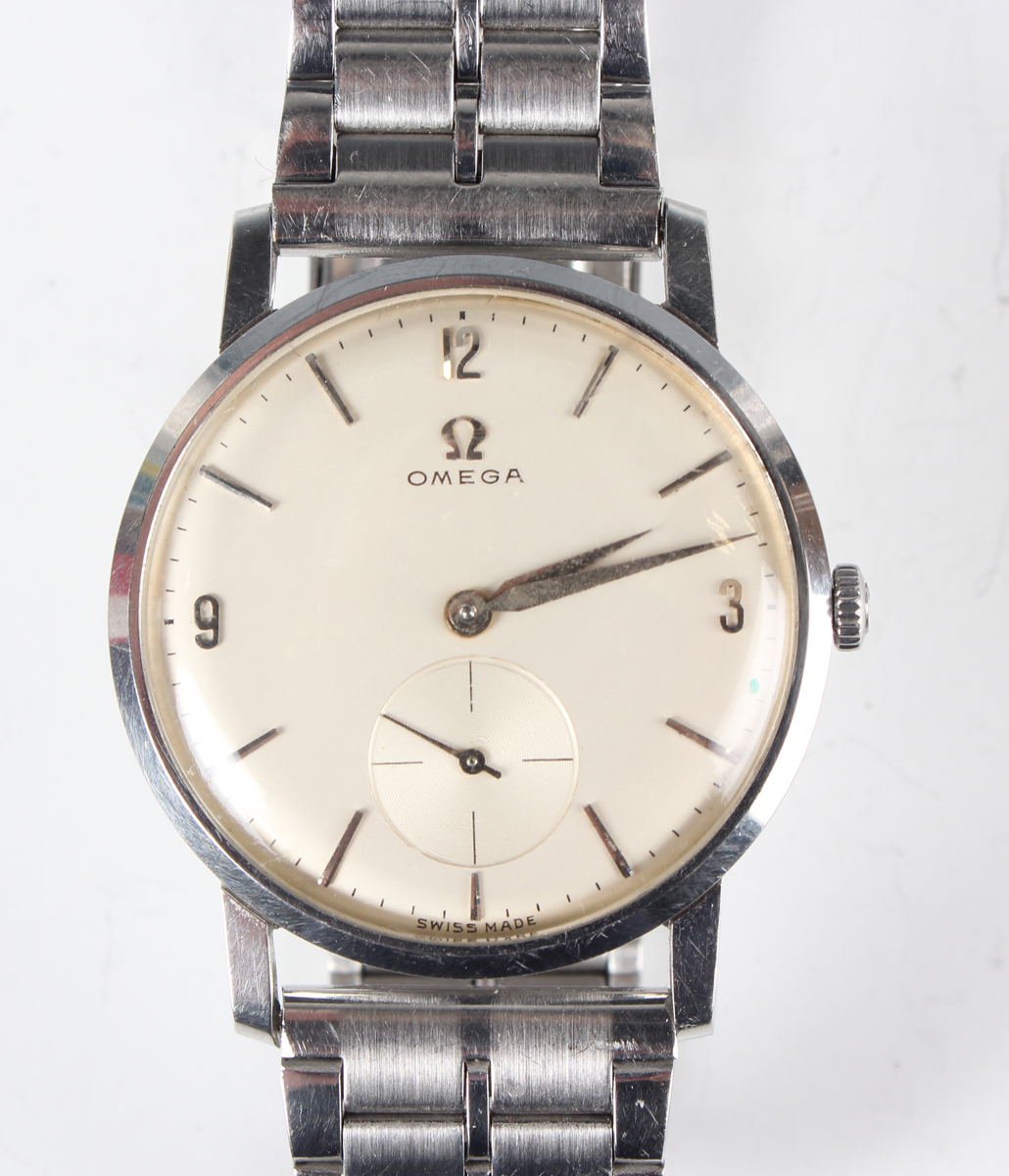 An Omega steel circular cased gentleman's wristwatch, Ref. 14727, circa 1958, the signed and jewelled 510 caliber manual movement numbered '16810828', the signed silvered dial with Arabic numeral and baton hour markers and subsidiary seconds, the signed case back interior numbered '14727 1', case diameter 3.3cm, on a matched steel bracelet with foldover clasp, with an Omega red leather case.