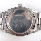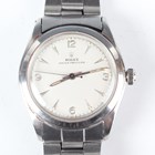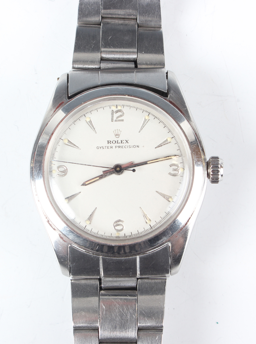 A Rolex Oyster Precision stainless steel gentleman's bracelet wristwatch, Ref. 6082, circa 1962, with signed and jewelled movement, the signed silvered dial with Arabic numeral and arrowhead hour markers, the case numbered between the lugs '6082' and '781336', Rolex crown to winding button, the tapered link bracelet with signed foldover clasp, case width 3.4cm.