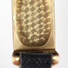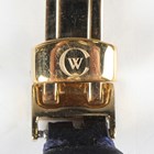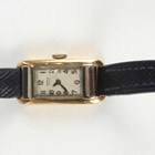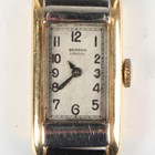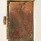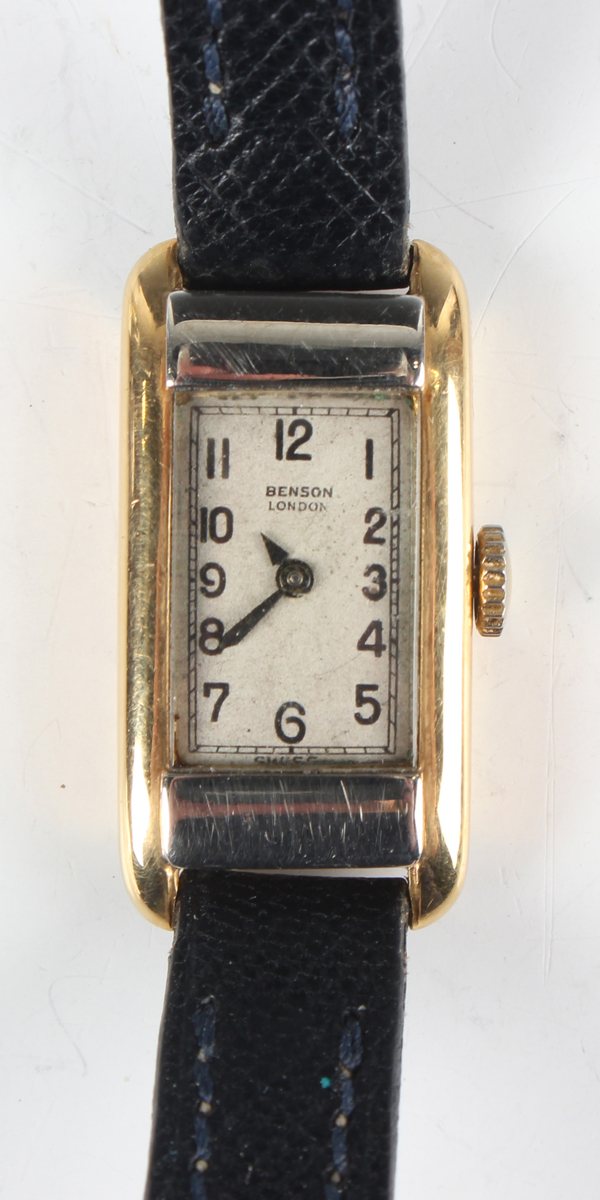A Benson London 18ct two colour gold rectangular cased lady's wristwatch, the unsigned jewelled Swiss movement numbered '13521', the signed silvered dial with black Arabic hour numerals, the case back interior detailed '18 750' and numbered '08519' above '0505', case width 1.4cm, on a black leather strap with gilt metal folding deployment clasp, total weight 16.6g.