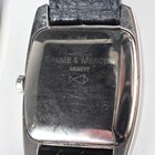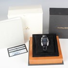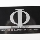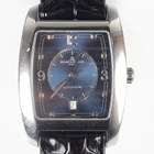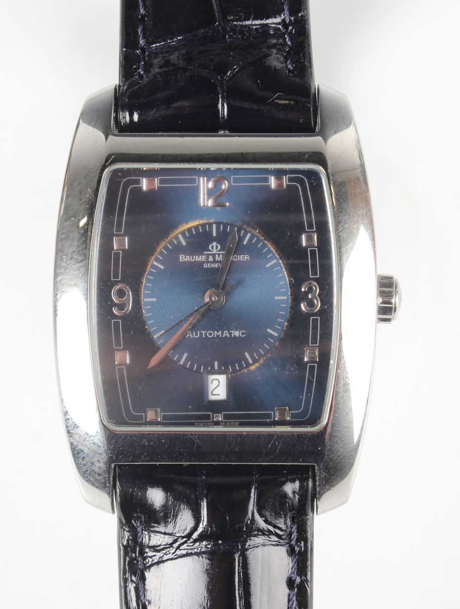 A Baume & Mercier Automatic Hampton stainless steel curved rectangular cased gentleman's wristwatch, Ref. MV 045 159, the signed dark blue dial with date aperture at 6 o'clock, the signed case back detailed 'MV. 045 159' and numbered '2775706', the black leather strap with signed foldover deployment clasp, case width 3cm, with case, outer card cover, instruction booklet and guarantee card, dated '3/06/00'.