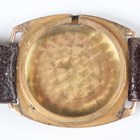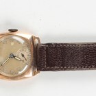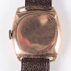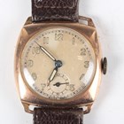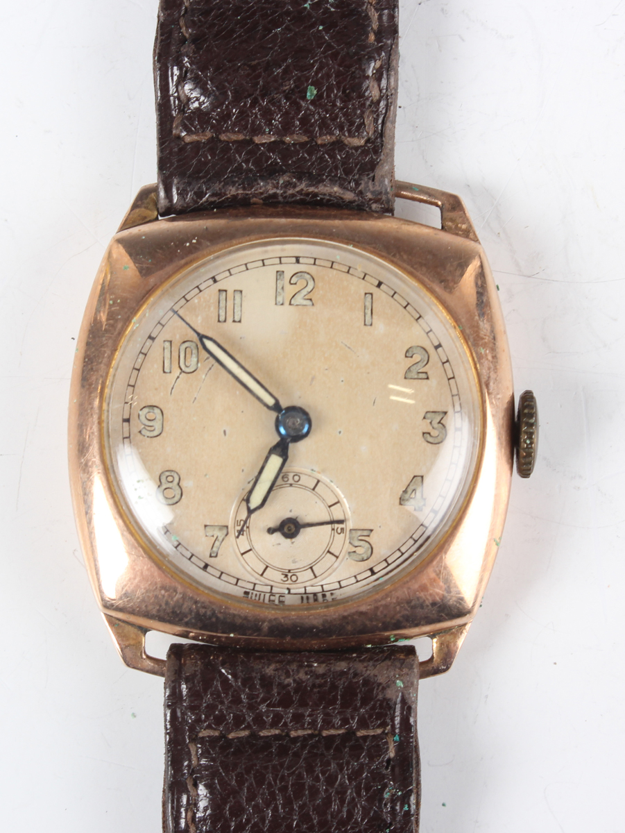 A 9ct gold cushion cased gentleman's wristwatch with unsigned jewelled movement, the unsigned silvered dial with luminous Arabic hour numerals and subsidiary seconds, London 1944, case width 2.8cm, on a brown leather strap, total weight 23.6g.