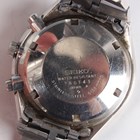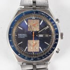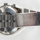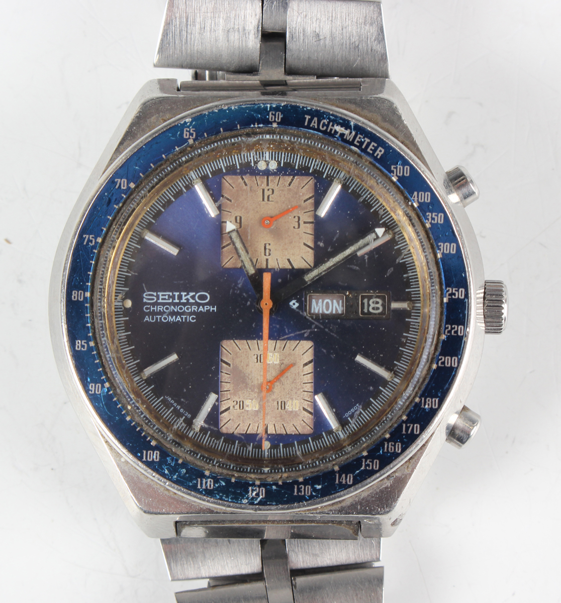 A Seiko 'Kakume' Chronograph Automatic stainless steel gentleman's bracelet wristwatch, Ref. 6138-0030, circa August 1977, with signed and jewelled 6138 B caliber movement, the signed blue dial with silvered baton hour markers, two silvered square subsidiary dials, day and date apertures and centre stop seconds, the case with blue tachymeter scale bezel, the signed case back numbered '780143' and '6138-0030', the tapered link bracelet with signed foldover clasp, case width 4.2cm.