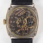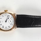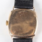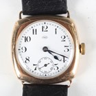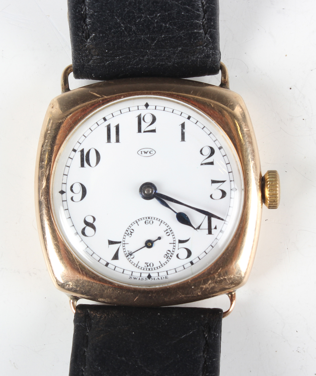 An IWC (International Watch Company) 9ct gold cushion cased gentleman's wristwatch, the signed and jewelled C83 caliber manual wind movement numbered '686696', the signed white enamelled dial with black Arabic hour numerals and subsidiary seconds, the case back interior '247736', Birmingham 1922, case width 3cm, on a black leather strap, total weight 35.2g.