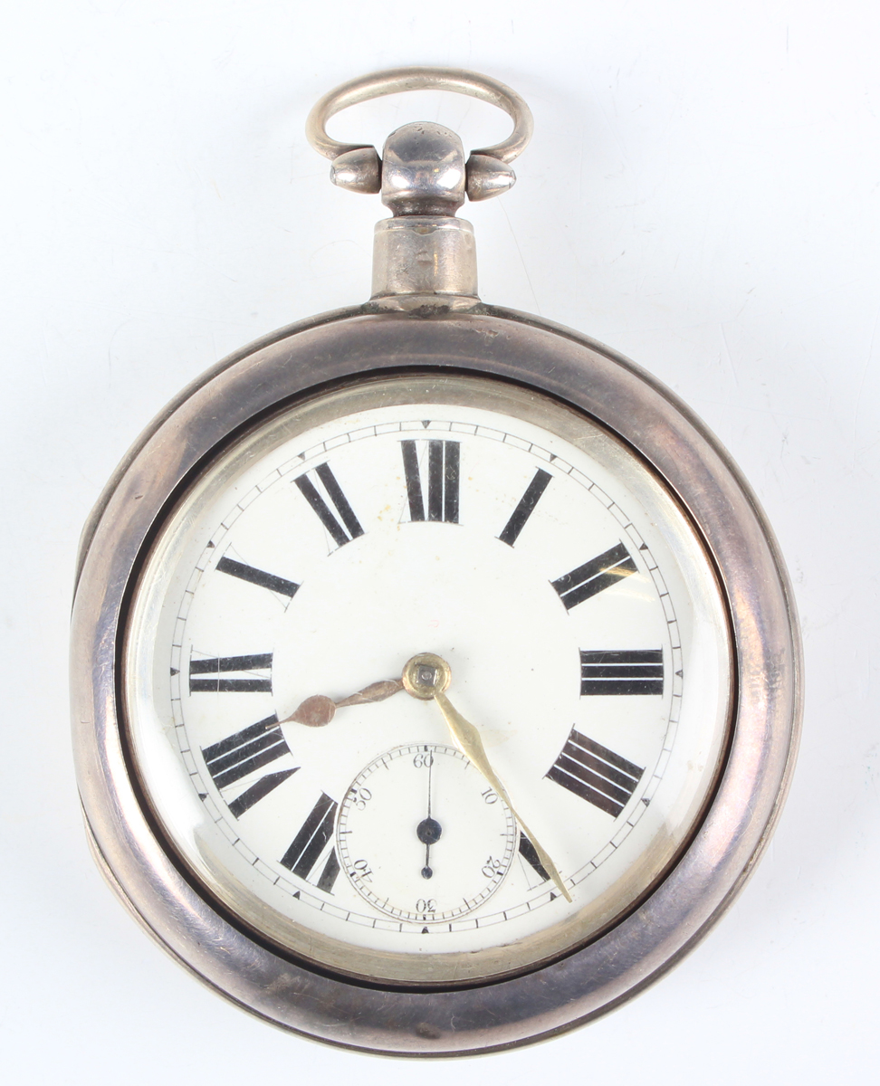 A late Victorian silver pair cased keywind open-faced gentleman's pocket watch, the unsigned gilt movement with gilt metal dust cover, the white enamelled dial with black Roman numerals and subsidiary seconds, the inner and outer cases Birmingham 1891, total weight 175.4g, outer case diameter 5.9cm.