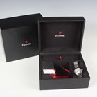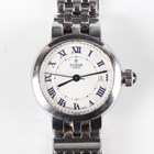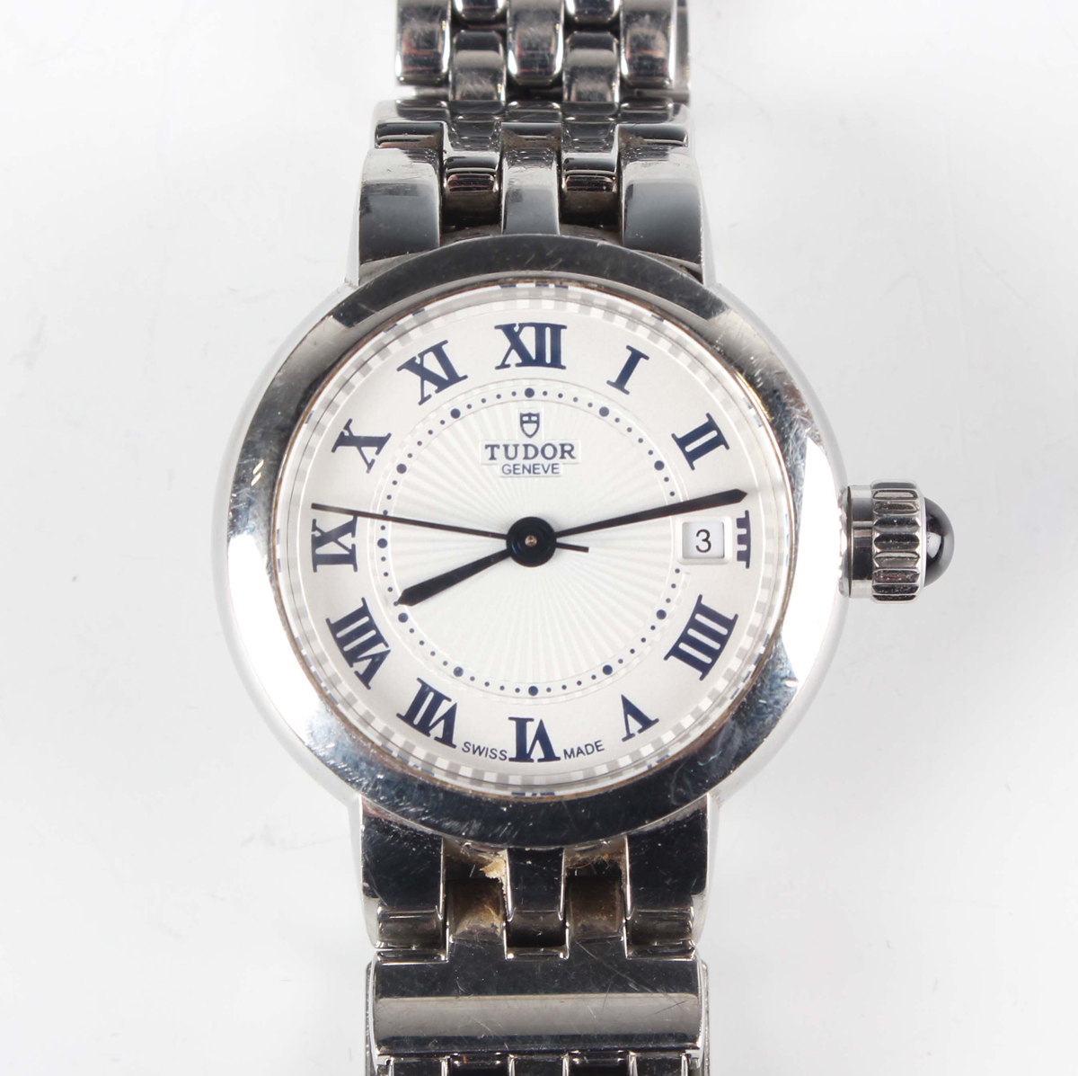 A Tudor Clair de Rose stainless steel circular cased lady's bracelet wristwatch, Ref. M35200-0001, the signed silvered dial with Roman hour numerals and subsidiary seconds, the winding crown with blue spinel cabochon, the case back with engraved Tudor rose motif and detailed 'FS52615' and '35200', the tapered link bracelet with signed foldover clasp, case diameter 2.6cm, with case and outer card box.