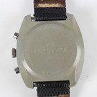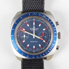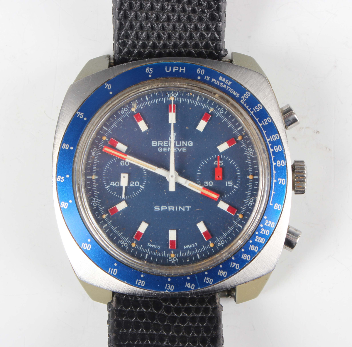 A Breitling Genève Sprint resin tonneau cased gentleman's chronograph wristwatch, Ref. 2016, circa 1970s, with Valjoux 7733 caliber manual wind movement, the signed blue dial with red and white baton hour markers, two subsidiary dials and centre stop seconds, the case with blue pulsation scale bezel, the signed grey resin case back numbered '2016', case width 4cm, on a black leather strap.