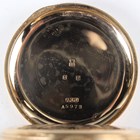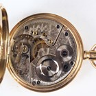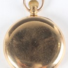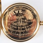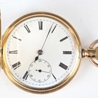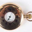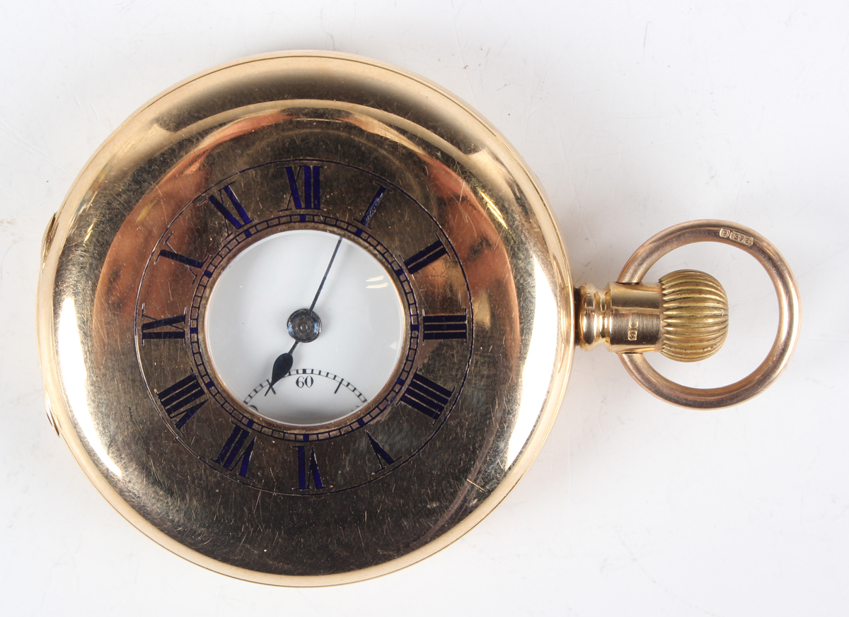 An 18ct gold half-hunting cased keywind gentleman's pocket watch, the jewelled lever movement detailed 'Palatine 15 Jewels' and numbered '639547', the unsigned white enamelled dial with black Roman hour numerals and subsidiary seconds, the gold inner case back with engraved presentation inscription, Birmingham 1905, total weight 106.6g, case diameter 4.9cm (with replacement 9ct gold bow).