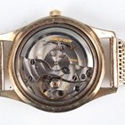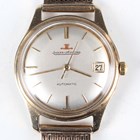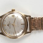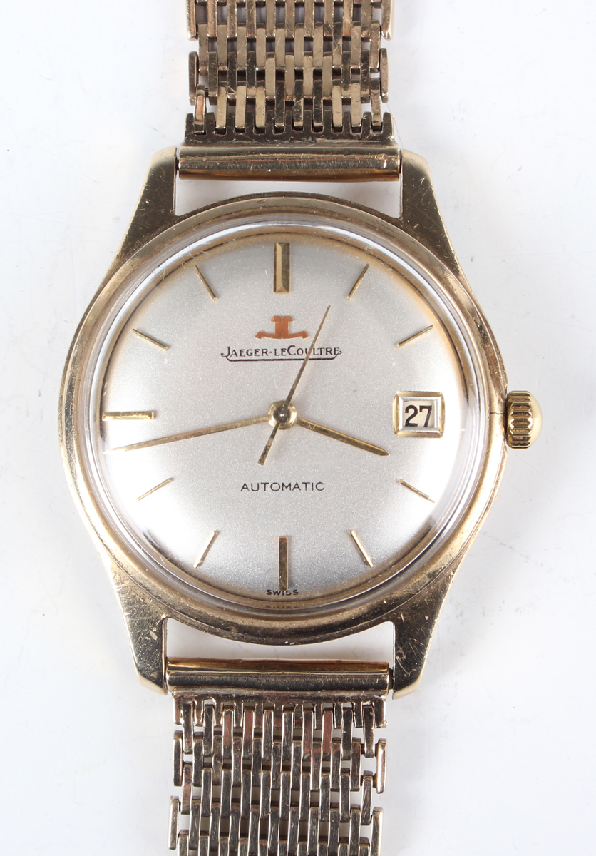 A Jaeger-LeCoultre Automatic 9ct gold circular cased gentleman's wristwatch, the signed and jewelled K881 caliber movement numbered '1582915', the signed silvered dial with gilt baton hour markers and date aperture, the case back numbered '33422', London 1963, case diameter 3.4cm, on an associated 9ct gold open link bracelet with foldover clasp, Birmingham 1966, total weight 68.4g, total length 19cm.