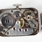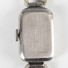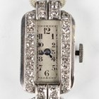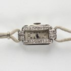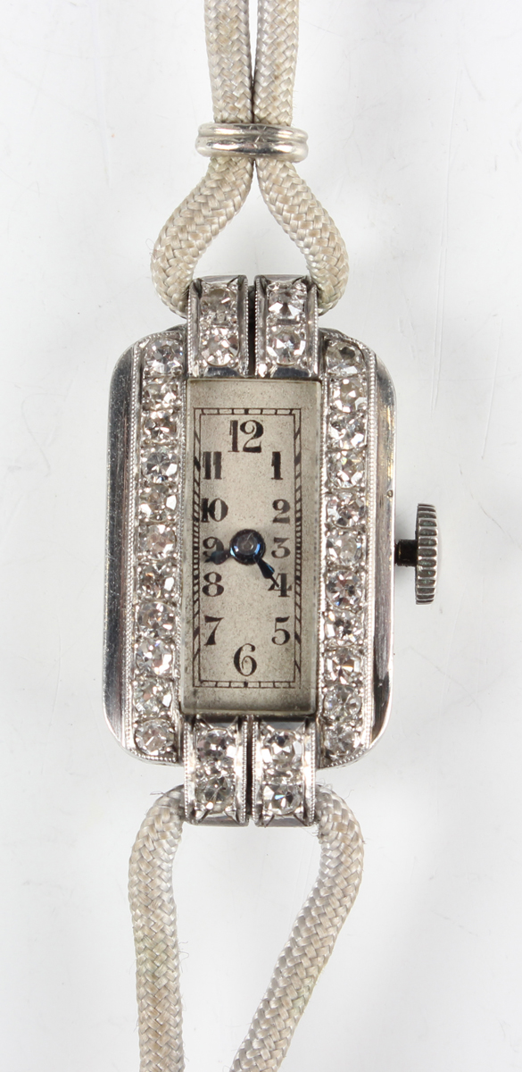 A diamond set rectangular cased lady's wristwatch with unsigned jewelled movement, the unsigned silvered dial with black Arabic hour numerals, the case front set with circular cut diamonds, case width 1.3cm, on a cord strap, total weight 11.4g.