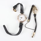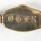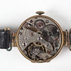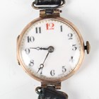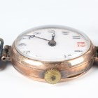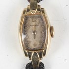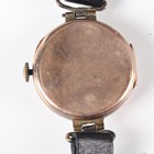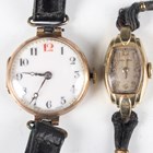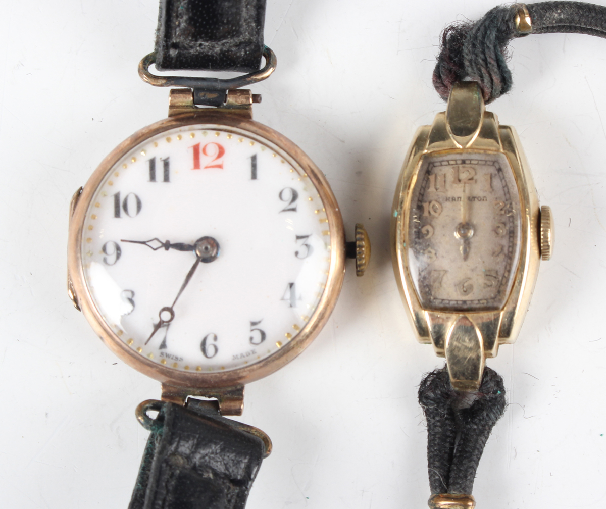 A 9ct gold circular cased lady's wristwatch with unsigned jewelled movement and white enamelled dial, import mark Glasgow 1922, case diameter 2.5cm, on a black leather strap, total weight 16g, together with a Hamilton gilt metal lady's wristwatch, the case back detailed '14K Gold Filled', case width 1.3cm.