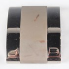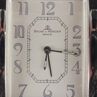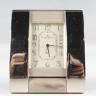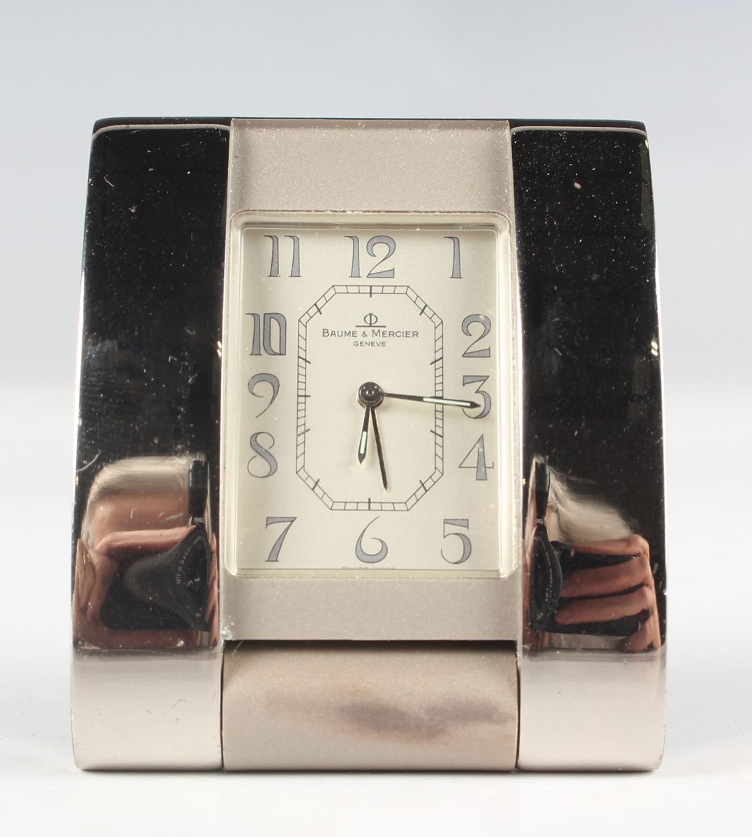 A Baume & Mercier stainless steel cased folding pocket/bedside alarm watch with quartz movement, the signed dial with Arabic hour numerals, the curved rectangular case with folding easel stand, height 5cm, with Baume & Mercier black fabric pouch.