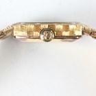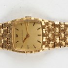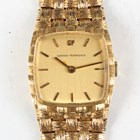 A Girard-Perregaux 9ct gold lady's bracelet wristwatch with gilt metal back, the signed and jewelled manual wind movement numbered '740-938', the signed gilt dial with baton hour markers, the basket weave decorated case and tapered bracelet with foldover clasp, detailed 'GWC 375', total weight 38.3g, case width 2.3cm, total length 16.5cm.