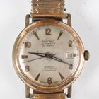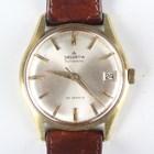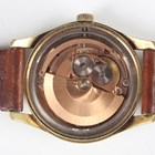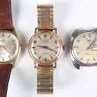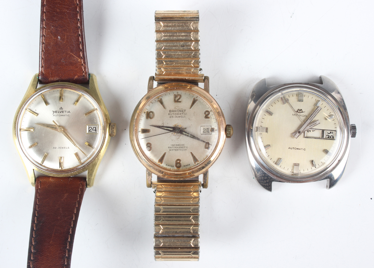 A Helvetia Automatic gilt metal fronted and steel backed circular cased gentleman's wristwatch, the signed silvered dial with gilt baton hour markers and date aperture, case diameter 3.5cm, on a brown leather strap, together with a Baronet Automatic gilt metal fronted and steel backed gentleman's wristwatch, case diameter 3.3cm, on an expanding gilt metal bracelet, and a stainless steel automatic gentleman's wristwatch with unsigned movement, the silvered dial detailed 'Movado', case width 3.7cm.
