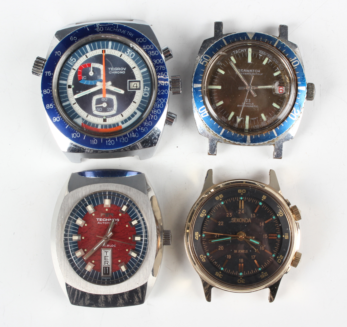 A group of four gentlemen's wristwatches, comprising a Tegrov Chrono stainless steel backed wristwatch, case width 4cm, a Technos Automatic steel cased wristwatch, case width 3.5cm, a Seawatch steel backed wristwatch, case width 3.6cm, and a Sekonda gilt metal fronted and steel backed circular cased wristwatch, case diameter 3.6cm.