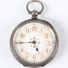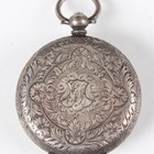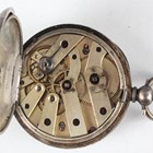 A Swiss 0.935 silver cased keywind open-faced lady's fob watch with unsigned lever movement, the white enamelled dial with puce Arabic hour numerals with gilt surrounds, the case foliate engraved, the case back and inner case interior detailed '0,935', case diameter 3.5cm.