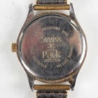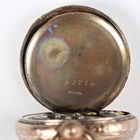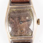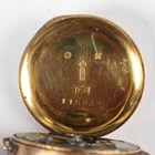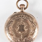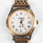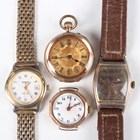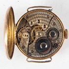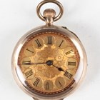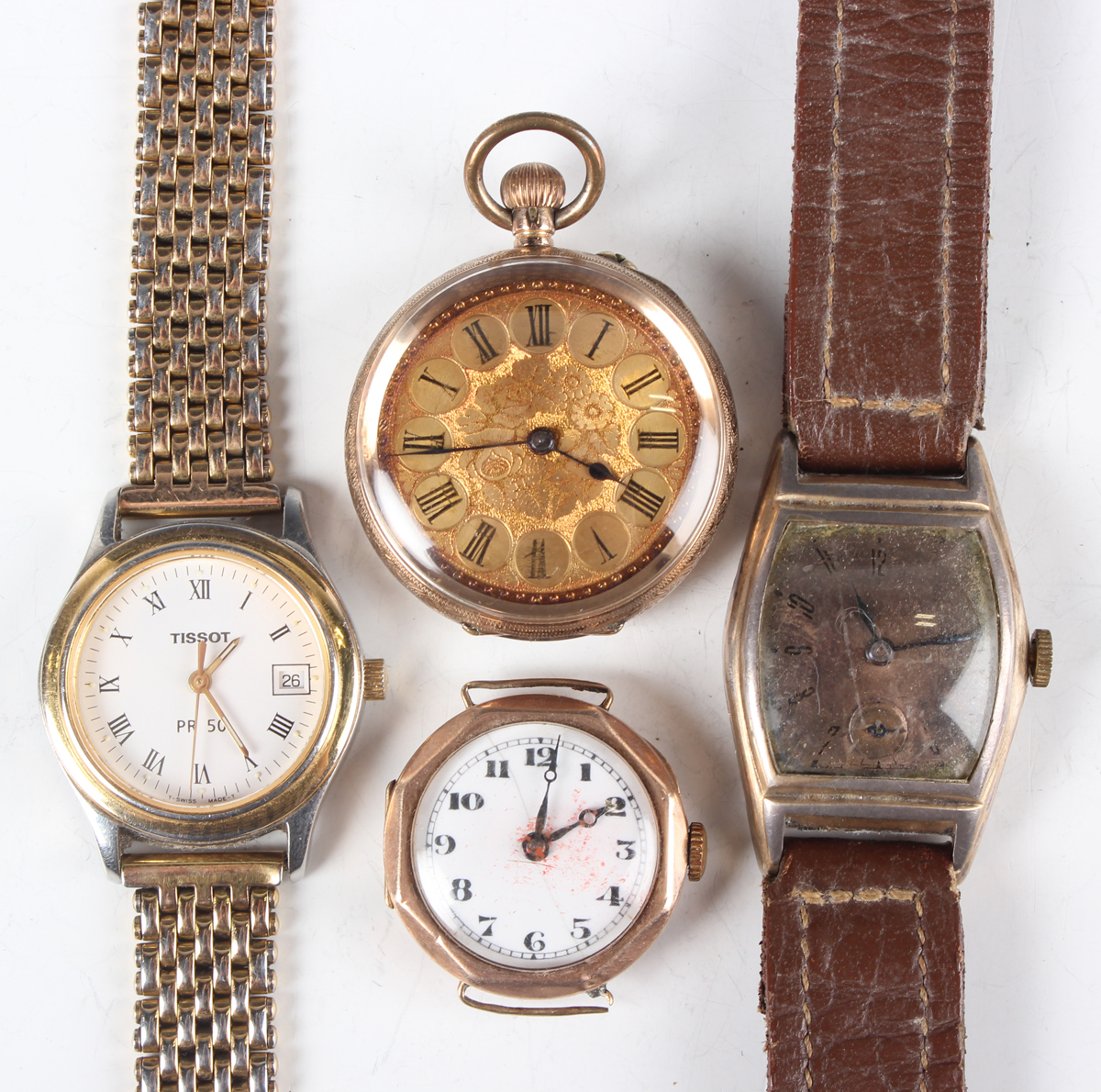 A 14K gold cased keywind open-faced lady's fob watch, the foliate engraved gilt dial with black Roman hour numerals, gilt metal inner case, the case foliate engraved, the case back interior detailed '14K', total weight 25.4g, case diameter 3.3cm, together with a 9ct gold circular cased lady's wristwatch, import mark London 1924, total weight 13.2g, case diameter 2.5cm, a gilt metal cased gentleman's wristwatch and a Tissot steel and gilt lady's bracelet wristwatch.