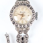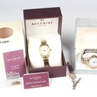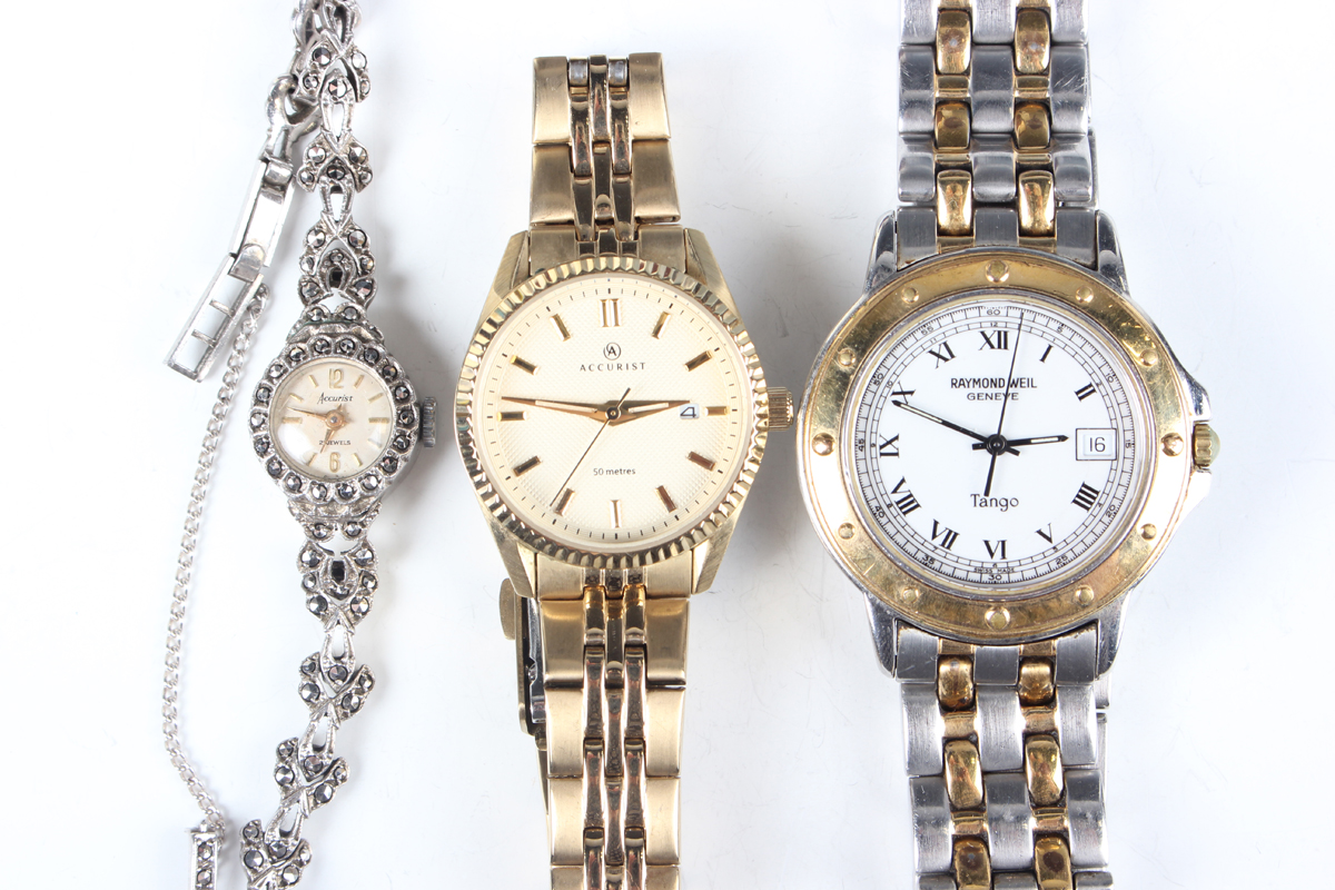 A Raymond Weil Tango stainless steel and gilt metal gentleman's bracelet wristwatch, Ref. 5560, with quartz movement, case diameter 3.6cm, together with an Accurist quartz gilt metal lady's bracelet wristwatch, boxed, and an Accurist silver and marcasite lady's bracelet wristwatch, Birmingham 1989.