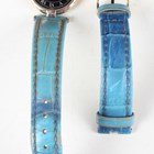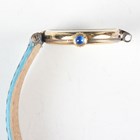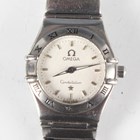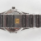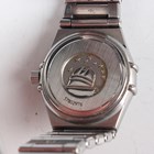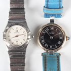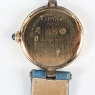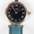 A Must de Cartier Vendôme silver gilt circular cased lady's wristwatch with quartz movement, the signed black dial with silvered Roman hour numerals, the signed case back detailed '925' and numbered '18020562', case diameter 2.4cm, on a blue leather strap, together with an Omega Constellation stainless steel lady's bracelet wristwatch with quartz movement, the tapered link bracelet with foldover clasp, case width 2.2cm.