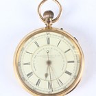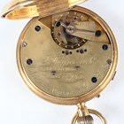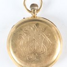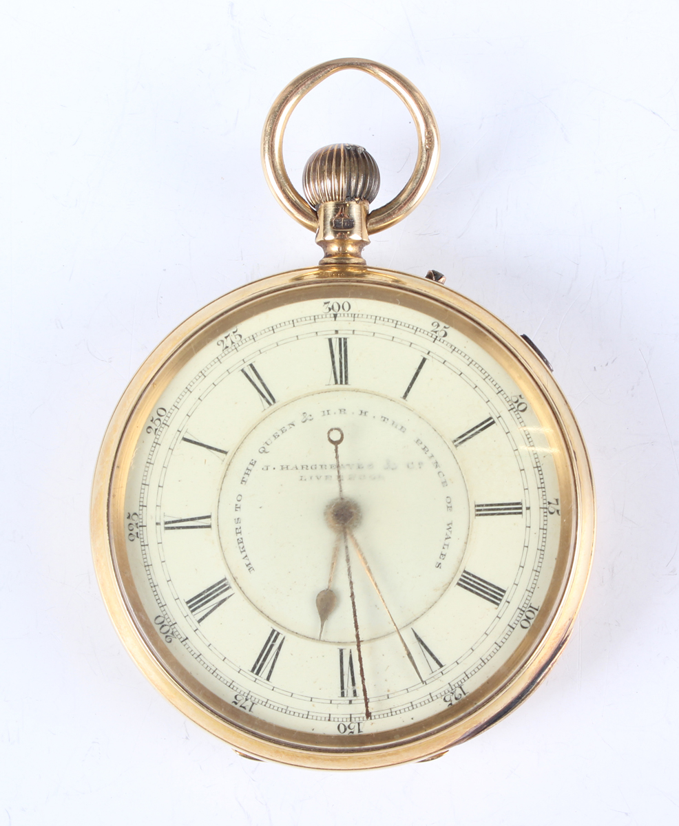 An 18ct gold cased keyless wind open-faced gentleman's chronograph pocket watch, the jewelled gilt three-quarter plate movement detailed 'J. Hargreaves & Co Liverpool No. 52658 makers to the Queen & H.R.H. The Prince of Wales', the similarly signed white enamelled dial with black Roman hour numerals and outer Arabic numerals, gold inner case, the case back monogram engraved, Chester 1892, total weight 118.9g, case diameter 5.1cm.