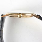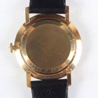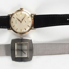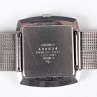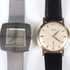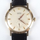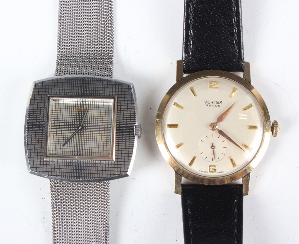A Vertex Revue 9ct gold circular cased gentleman's wristwatch with signed and jewelled manual wind movement, the signed dial with gilt Arabic numeral and baton hour markers and subsidiary seconds, the signed case back interior numbered '01893' above '481/1', case diameter 3.4cm, on a black leather strap, total weight 27.2g, together with a Seiko stainless steel Disco Chariot bracelet wristwatch, Ref. 2220-3240, circa August 1974, with signed and jewelled 2220A caliber manual wind movement, case width 3.3cm, total length 20.3cm.