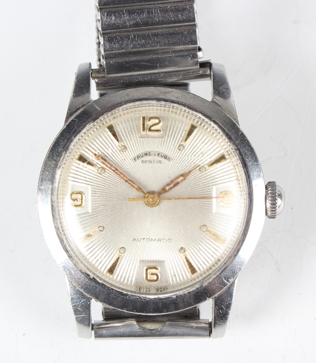 A Favre-Leuba Genève Automatic stainless steel circular cased gentleman's wristwatch with signed and jewelled ETA 1256 caliber movement, the signed silvered dial with gilt Arabic numeral and arrow head hour markers, the case back numbered '24163' above '3291', case diameter 3.4cm, on an expanding bracelet.
