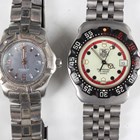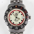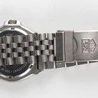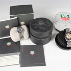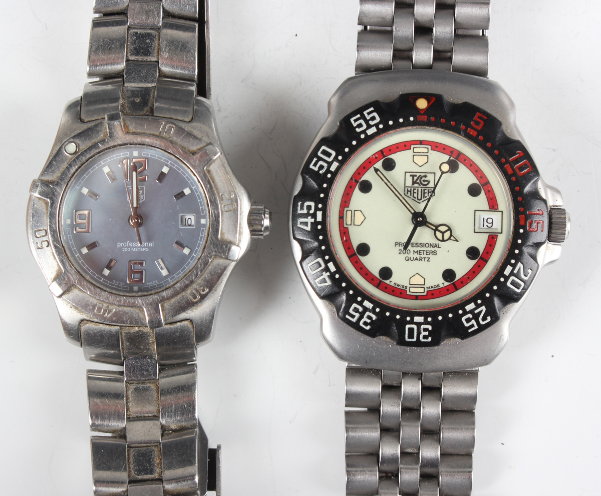A Tag Heuer Formula 1 Professional 200 Metres Quartz stainless steel gentleman's mid-size bracelet wristwatch, Ref. WA1211, the signed luminous dial with date aperture, the case with rotating black bezel, the signed case back detailed 'WA1211', on a tapered link bracelet with signed foldover clasp, case width 3.5cm, with a plastic cylindrical case, outer card box, instruction booklet and guarantee card, together with a Tag Heuer Professional 200 Metres Quartz stainless steel lady's bracelet wristwatch, Ref. WN1318, with signed mother-of-pearl dial, the bracelet with foldover clasp, case width 2.9cm, with cylindrical case, two spare links and international guarantee card.