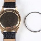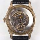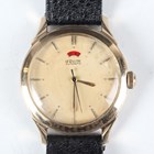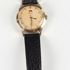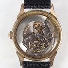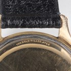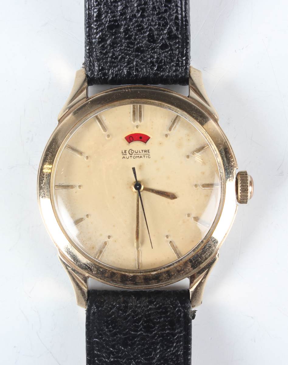 A LeCoultre Automatic gilt metal circular cased gentleman's wristwatch, Ref. 8986, circa 1950s, the signed and jewelled 481 caliber movement numbered '1044091', the signed cream dial with gilt baton hour markers and power reserve indicator at 12 o'clock, the signed case back interior numbered '54001501' over '8986', the case back detailed '10K Gold Filled Apex', case diameter 3.4cm, on a black leather strap.