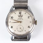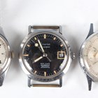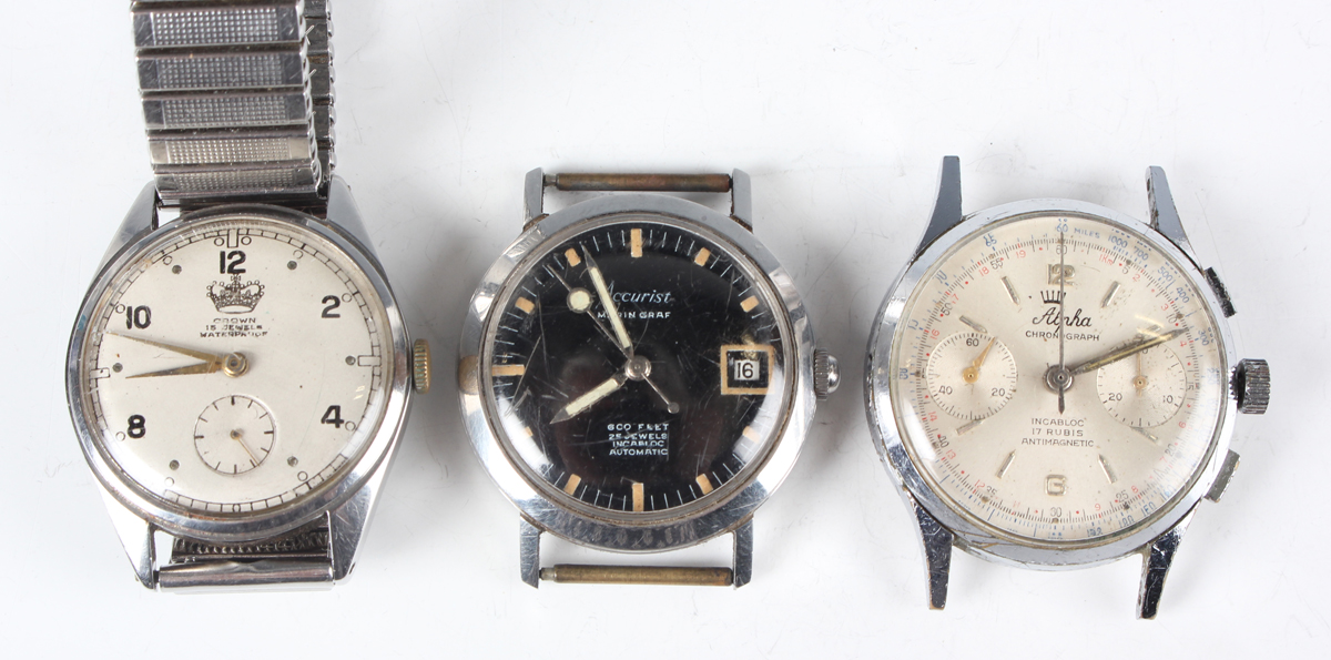 An Accurist Marin Graf Automatic stainless steel backed circular cased gentleman's wristwatch, the signed black dial with date aperture, case diameter 3.4cm (lacking bezel), together with an Alpha Chronograph steel backed gentleman's wristwatch, case diameter 3.4cm, and a Crown steel cased gentleman's wristwatch, case diameter 3.1cm, on an expanding bracelet.