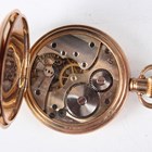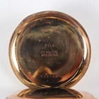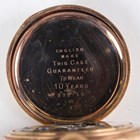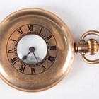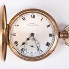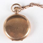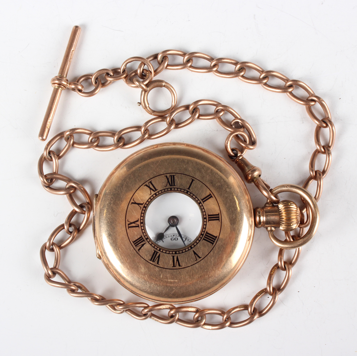 A gilt metal half-hunting cased keyless wind gentleman's pocket watch with unsigned jewelled movement, the white enamel dial with black Roman hour numerals and subsidiary seconds and detailed 'Sir John Bennet Ltd London', case diameter 5cm, together with a 9ct gold open curblink Albert watch chain, fitted with a T-bar, swivel and boltring clasp, each link marked '9 .375', weight 38.6g, total length 39.4cm.