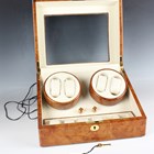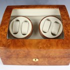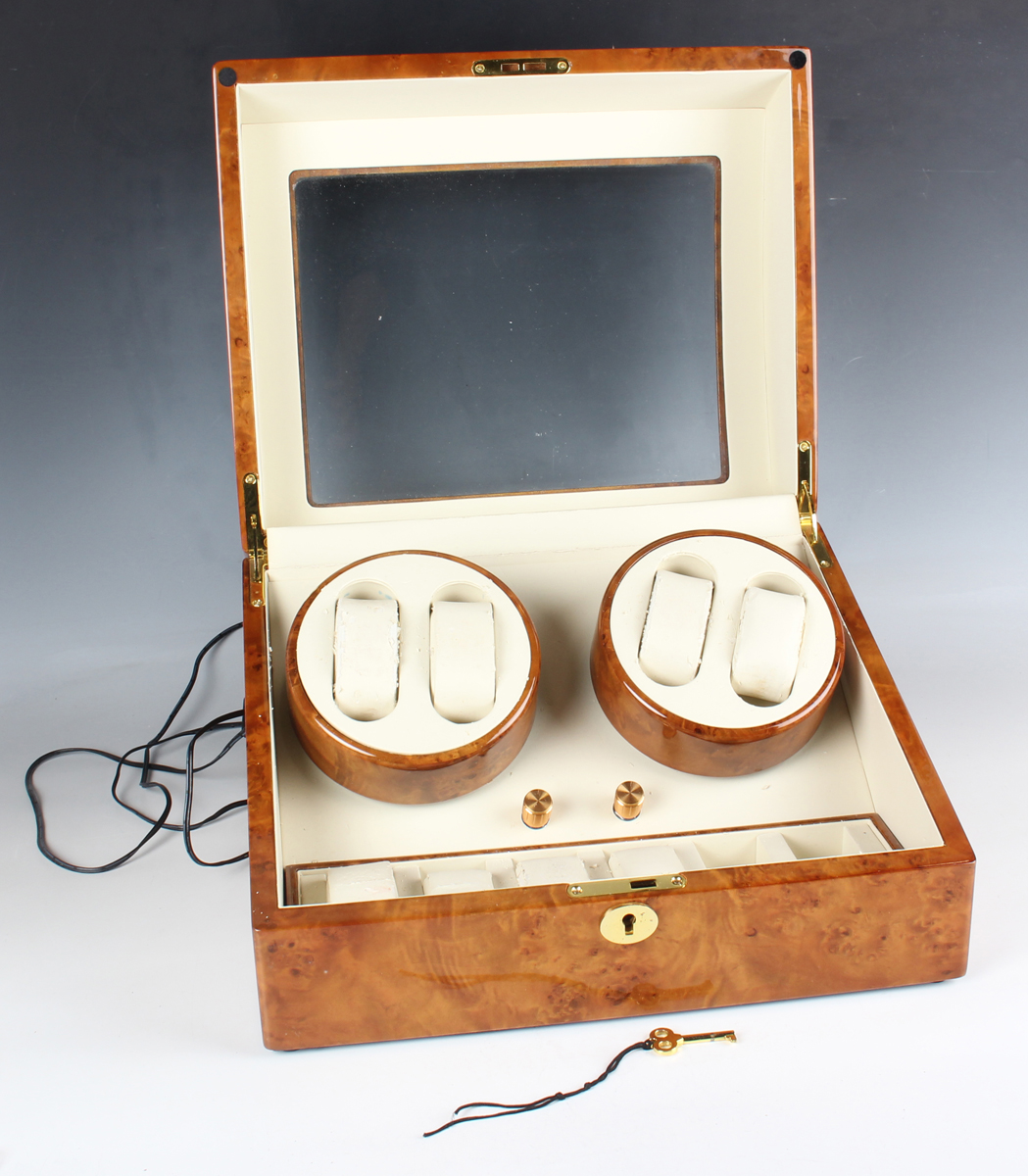 A laminated burr wood automatic watch winding and storage display case, the glazed sloping hinged lid revealing the capacity for four watch winding and six storage compartments, height 21.5cm.