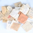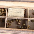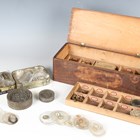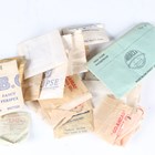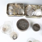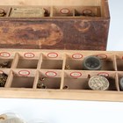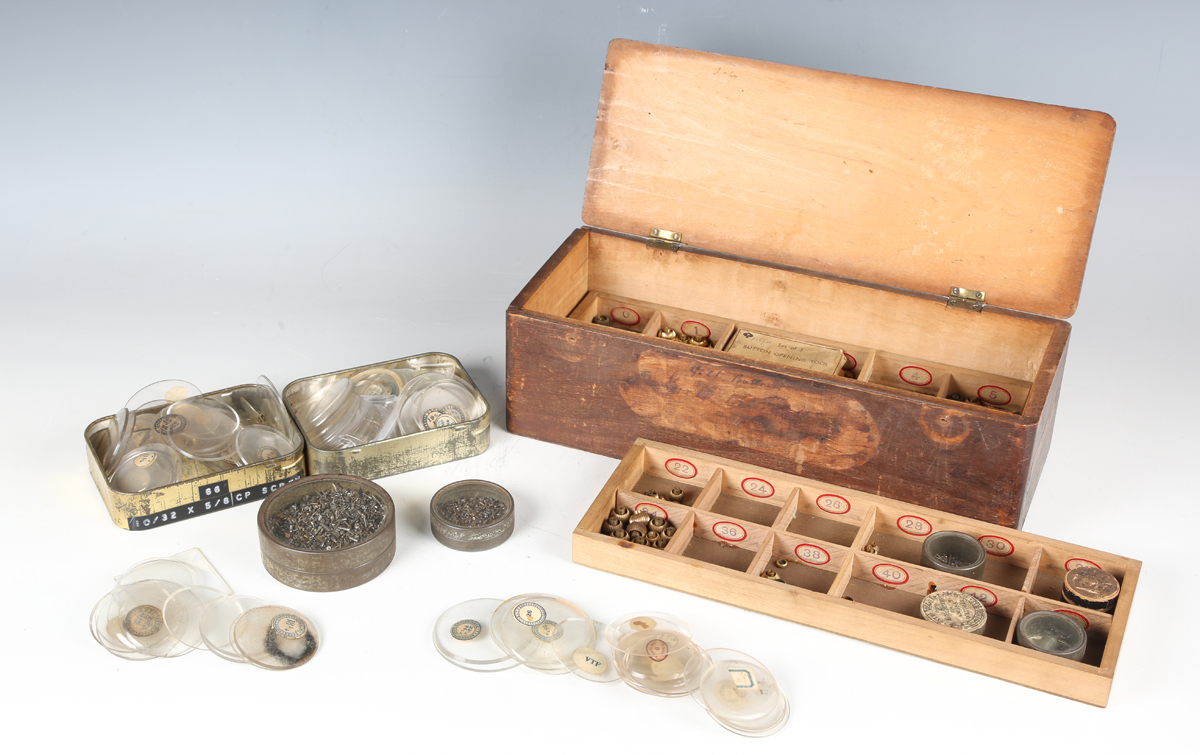 A collection of watchmaker's parts, including a quantity of pocket watch glasses/crystals, winding crowns and movement screws.