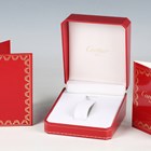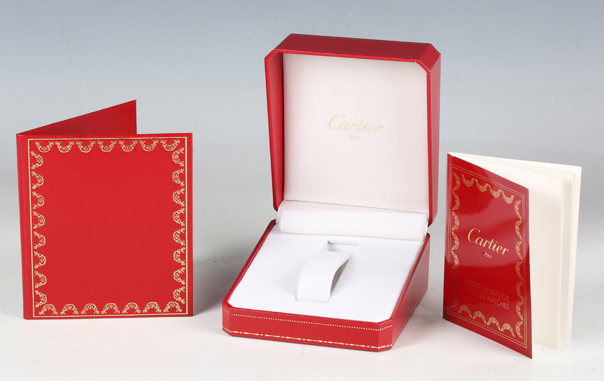 A Cartier 520 red leather covered wristwatch box with outer card case, Santos watch booklet and red wallet.