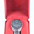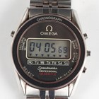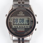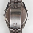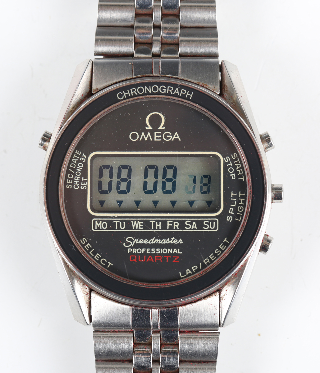 An Omega Speedmaster Professional Quartz LCD stainless steel gentleman's chronograph bracelet wristwatch, Ref. 186.0004, circa 1983, the signed and jewelled 1620 caliber movement numbered '39583151', the signed dial with digital display, the signed case back interior numbered '186 0004', the case back with Seamaster logo, the tapered link bracelet with signed foldover clasp, case width 3.6cm, with original Omega box.