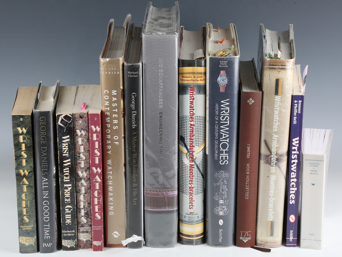 A collection of wristwatch related reference books, including 'IWC Schaffhausen Engineering Time Since 1868' by Manfred Fritz, Paulo Coelho and Enki Bilal, 'Patek Philippe Collection Book', 'Masters of Contemporary Watchmaking' by Michael Clerizo and 'George Daniels A Master Watchmaker & His Art' by Michael Clerizo.