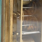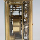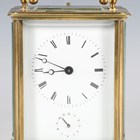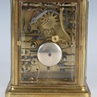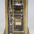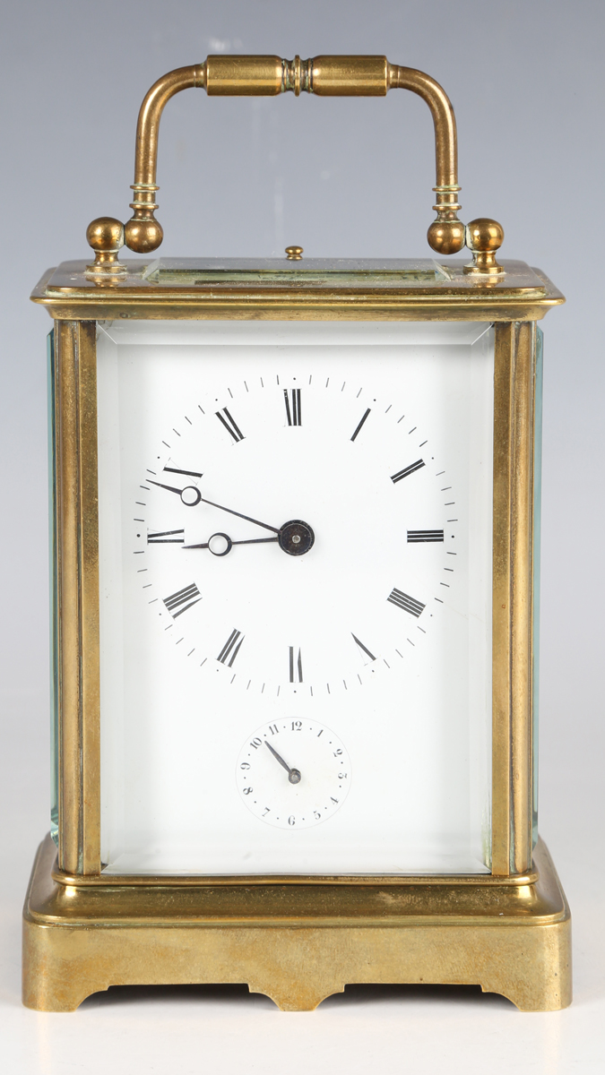 A late 19th century French brass corniche cased carriage alarm clock, the eight day movement striking hours and half hours, alarm and repeating on a single bell, the white enamelled dial with black Roman hour numerals and subsidiary alarm dial, the case with swing handle, bevelled glass panels and bracket feet, height 17.5cm, with winder.