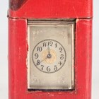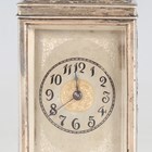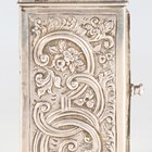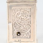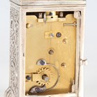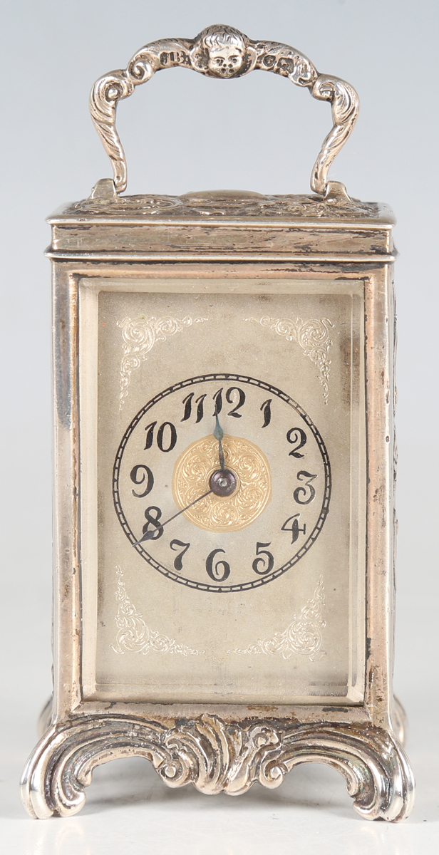 A late Victorian silver cased diminutive carriage timepiece, the eight day movement with platform escapement, the silvered dial with black Arabic hour numerals and engraved foliate scrolls, the case cast with flowers and foliate scrolls beneath a cherub mask scroll swing handle, London 1888 by Jane Brownett, height 10.4cm, with original red leather mounted travelling case, detailed 'Wilson & Gill...', and key.