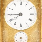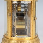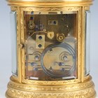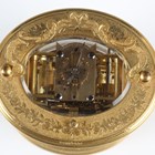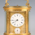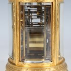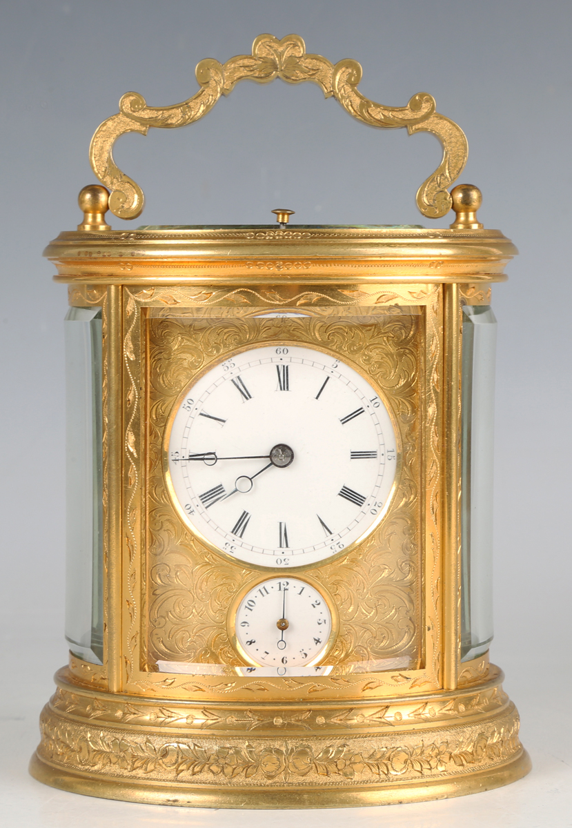 A late 19th century French engraved gilt brass oval cased carriage alarm clock by Drocourt, the eight day movement with platform escapement striking hours, half hours and alarm on a gong, with push repeat mechanism, the backplate with stamped maker's mark and numbered '7707', the white enamelled dial with black Roman hour and outer Arabic minute numerals above a subsidiary alarm dial, all framed by a foliate scroll engraved gilt surround, the oval case finely engraved with foliate scrolls, the swing scroll handle above bevelled glass panels, on a moulded base, height 17cm, with winding key.