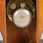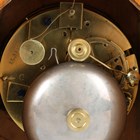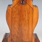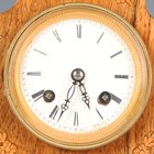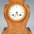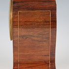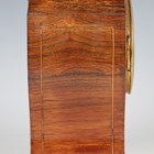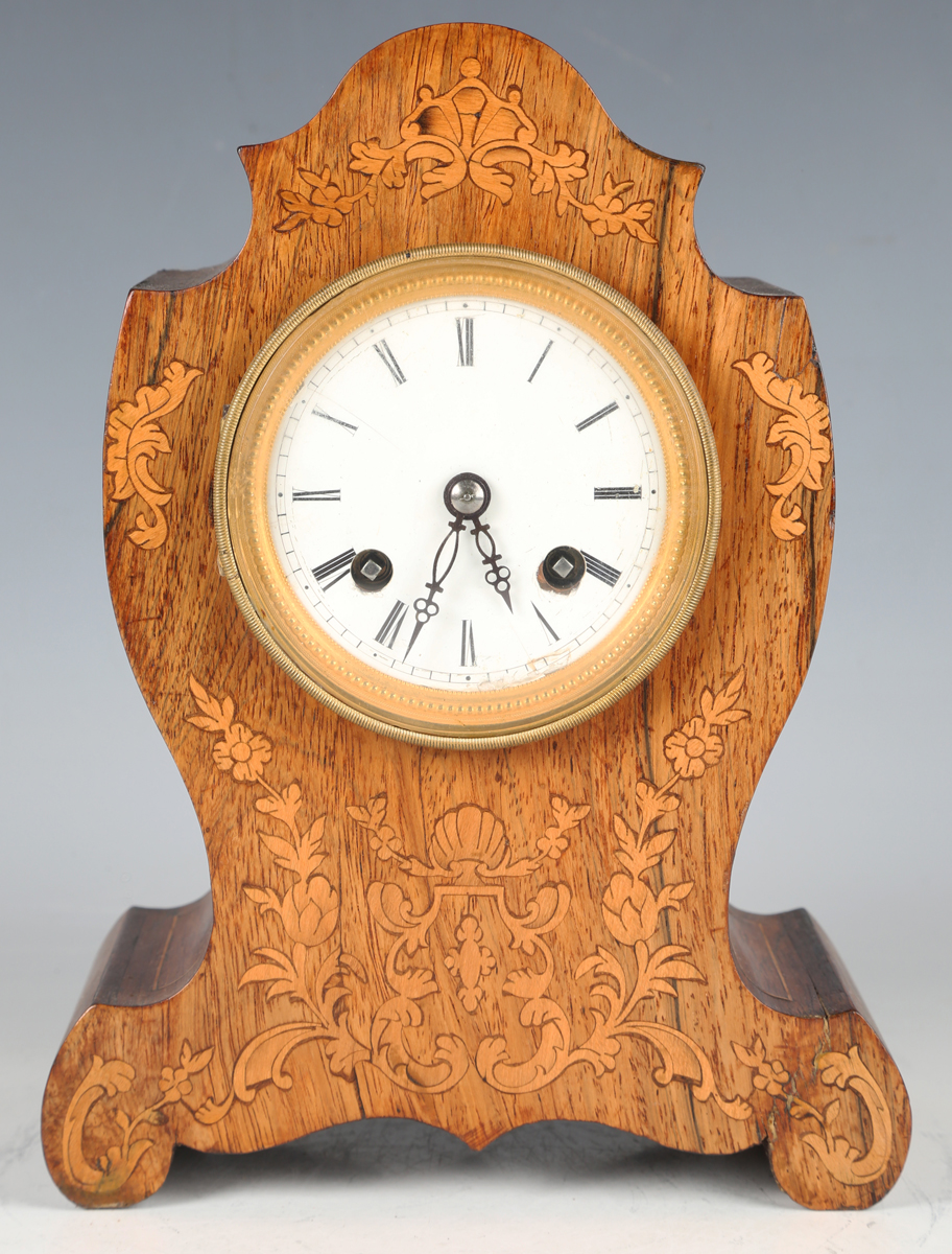 A late 19th century French inlaid rosewood mantel clock, the eight day movement with silk suspension striking on a bell via an outside countwheel, the backplate stamped 'Duval a Paris M.J17', the white enamelled circular dial with black Roman hour numerals, the case with boxwood inlaid foliate scrolls, height 22.5cm, with pendulum and winding key.