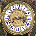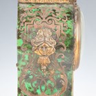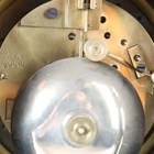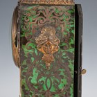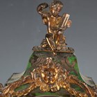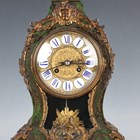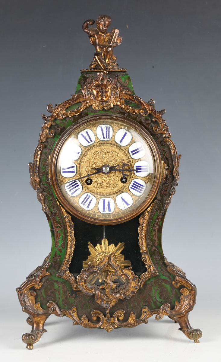 A late 19th century French gilt brass and green stained tortoiseshell boulle cased mantel clock with eight day movement striking on a bell, the backplate stamped 'A & N 28018', the embossed gilt dial inset with enamel hour markers with blue Roman numerals, the balloon shaped case with putto surmount above applied foliate scrolls, glazed lenticle and scroll legs, height 40cm, with pendulum.