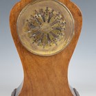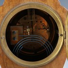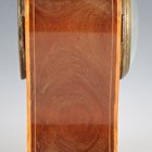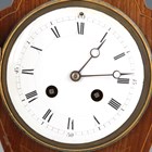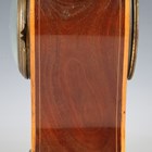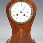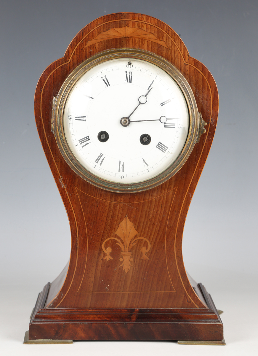 An Edwardian mahogany balloon cased mantel clock with eight day movement striking on a gong, the white enamelled dial with black Roman hour numerals, the balloon shaped case with inlaid decoration, on brass feet, height 29.5cm, with pendulum.