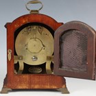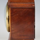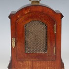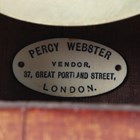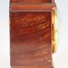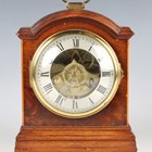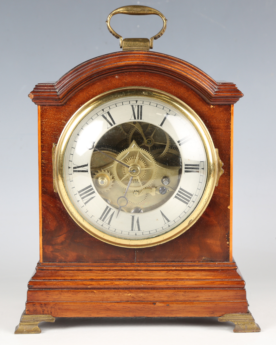 An early 20th century mahogany cased mantel timepiece with eight day brass single chain fusee movement, the 4-inch silvered chapter ring with black Roman hour numerals framing a skeletonized central movement display, the case with moulded arch pediment and brass carry handle, on a plinth base and brass bracket feet, applied label to interior detailed 'Percy Webster Vendor 37, Great Portland Street London', height 23.4cm, with pendulum.