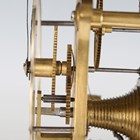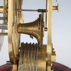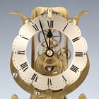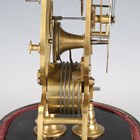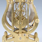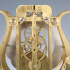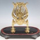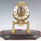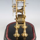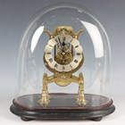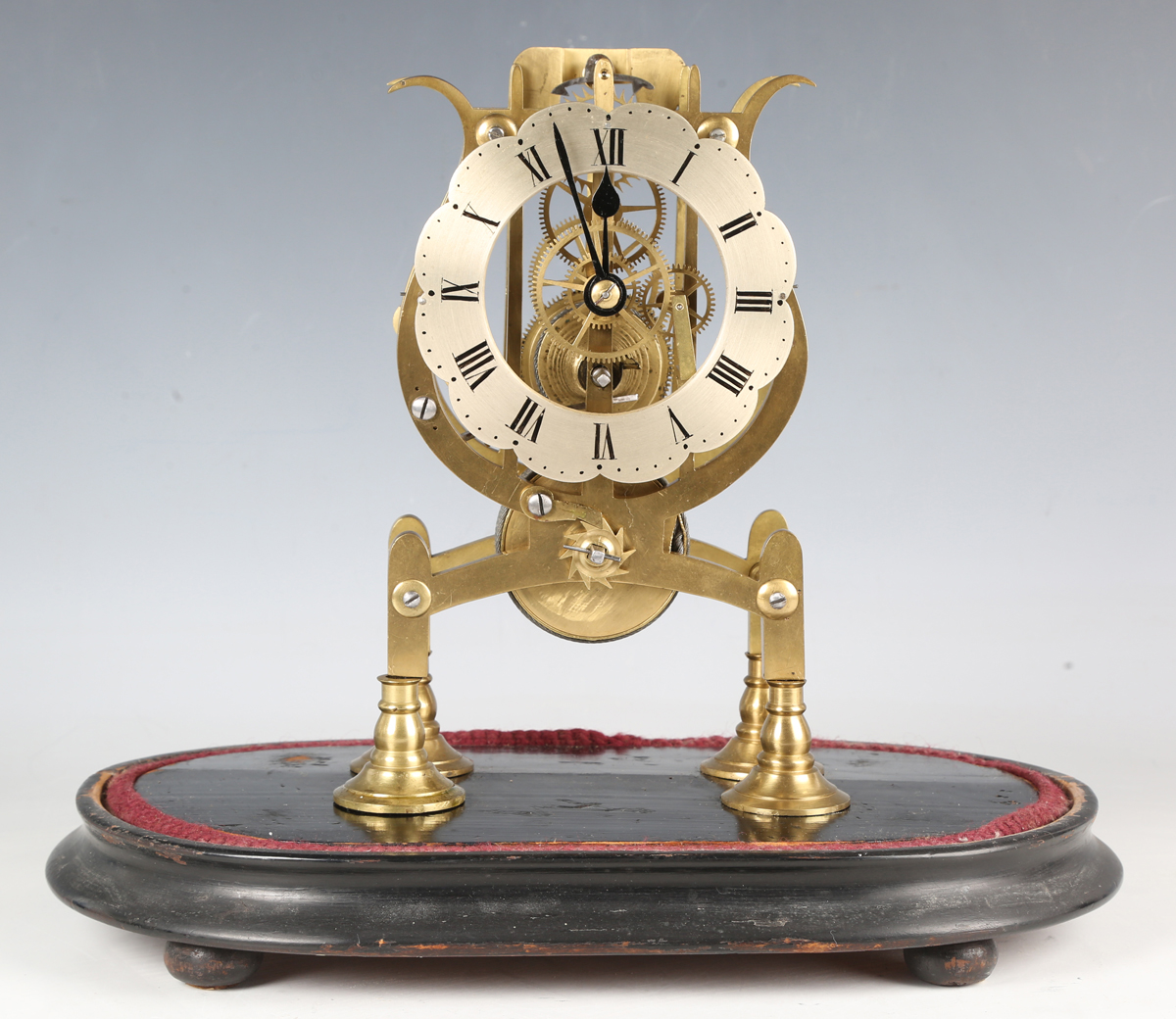 A late Victorian brass skeleton timepiece with eight day single fusee movement, the silvered chapter ring with black Roman hour numerals, the lyre shaped frame on an ebonized oval base with matched glass dome, total height 34.5cm, with pendulum.