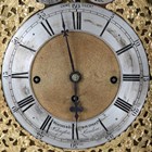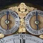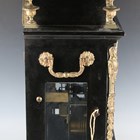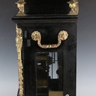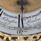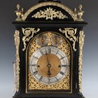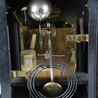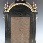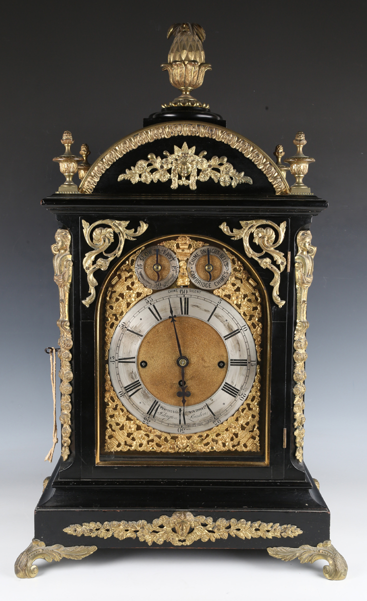 An impressive late Victorian ebonized and brass mounted bracket clock with eight day triple fusee movement chiming quarters on a nest of eight bells and striking hours on a gong, the 9-inch brass arched dial with silvered pendulum regulation and chime selection subsidiary dials to the arch, above a silvered chapter ring with black Roman hour numerals and outer Arabic minutes, inscribed 'Pickford & Co 177 & 178 Upper St, Islington London', framing a matt centre, all cornered with cast and pierced gilt foliate spandrels, the arched case surmounted with brass pineapple and urn finials, above a glazed door and side panels, flanked by a pair of caryatid and foliate cast corner columns, the sides with foliate drop handles, on a plinth base and cast scroll feet, height 72cm, with pendulum, winder and case key, together with original pierced brass side fret panels.